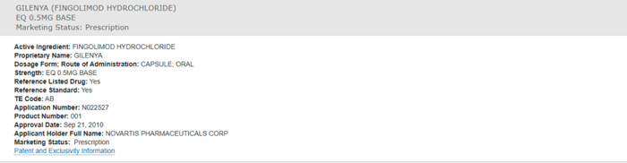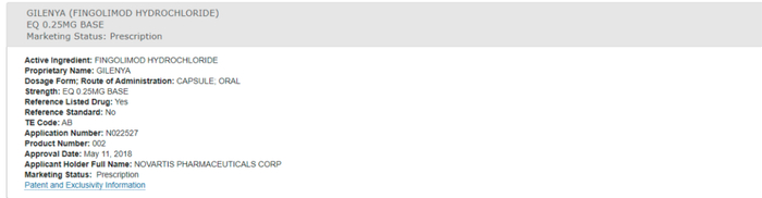 (0.25mg规格芬戈莫德胶囊,source:FDA,The Orange Book)