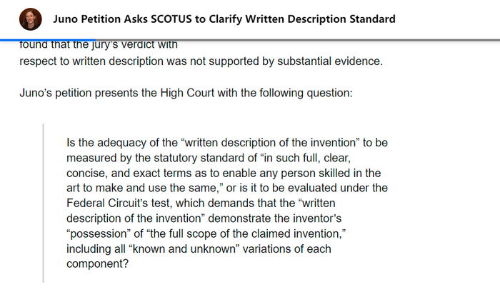 (Source: Juno Petition Asks SCOTUS to Clarify Written Description Standard,IPwatchdog)