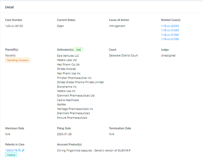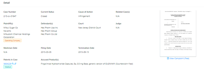2015年3月,针对229号专利,诺华曾以专利侵权为由,将东阳光制药(HEC Pharm)告上美国新泽西州法院,这起诉讼在同年9月就宣告终结。而后,诺华曾与包括Ezra、Actavis、Aurobindo Pharma等企业针对229号专利展开侵权诉讼。