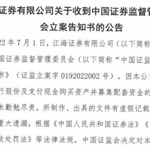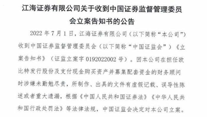 7月4日午间,江海证券于债券市场发布公告称,其收到证监会的立案告知书。由于担任欧比特项目财务顾问时涉嫌未勤勉尽责,证监会决定对江海证券立案。