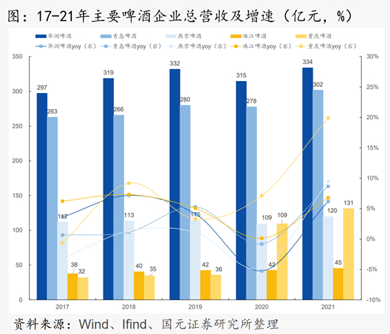 根据上图可知,燕京啤酒在营收方面已经与华润啤酒和青岛啤酒有着明显的差距,而在增速方面,也显著低于重庆啤酒。