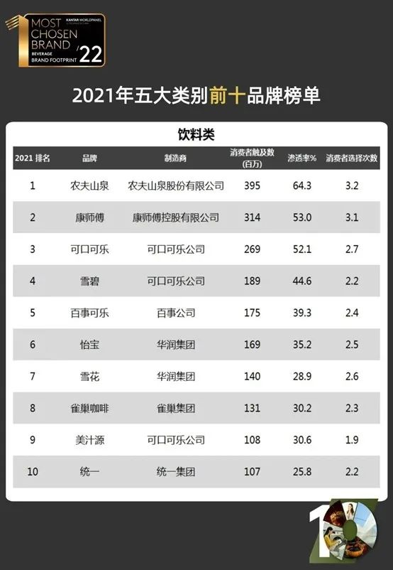 记者仔细去看了这个完整版榜单注意到,在2021年五大类别前十品牌榜单的饮料类中,华润集团的怡宝和雪花排在第6位和第7位。