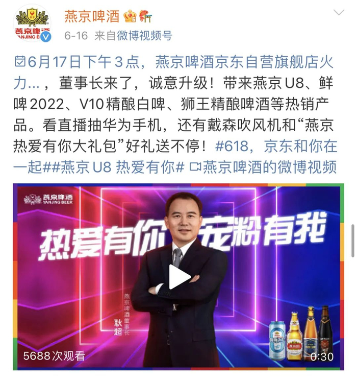 6月17日,耿超甚至亲自现身燕京啤酒的直播间,下场带货。或许他本人也没想过,新官上任不到一个月,首次大考就是市场一线的销售测试。