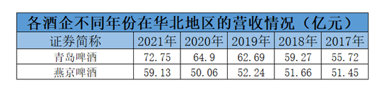 根据上表可知,青岛啤酒近年来在华北地区的营业收入持续增长中,而燕京啤酒在2013年的时候,其在华北地区的营收就已经达到了59.14亿元,近年来则是停滞不前的状态。