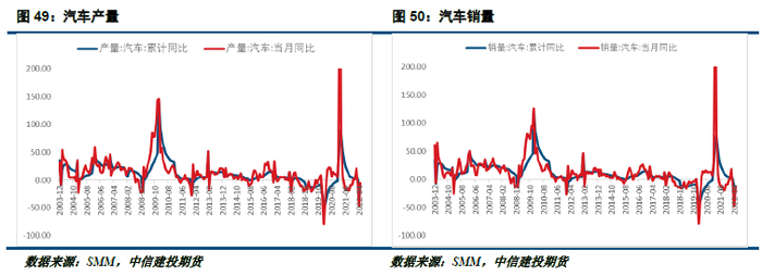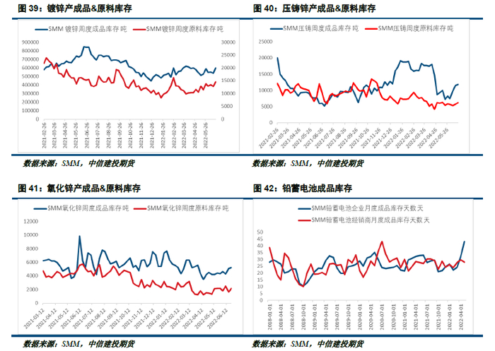初端产成品来看,镀锌板库存较往年同比较低,镀锌板库存偏低是因为今年国内镀锌企业开工率持续低位,镀锌整体处于供需两弱的局面。上海封城期间镀锌企业原材料短缺问题严重,供给较需求受影响更大,造成镀锌企业库存处在偏低水平。压铸锌行业原料库存量偏低,产成品库存在显著去化后近期有所反弹,这也反映出在疫情期间,整体行业普遍出现了成品去库,随着交通运输的恢复,下游逐渐补充原料,提速生产,导致产成品在近期有所堆积。