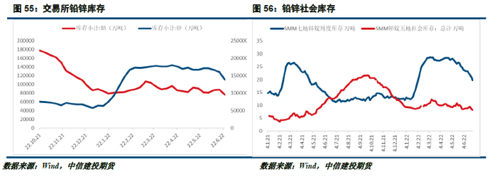 但是在进入二季度之后,一方面是国内疫情的影响,导致主要消费地区出现了两个月左右的停工期,大幅拖累了需求增速,导致显性库存上涨,终端开工率下滑。并且在宏观上,受到全球央行加息政策的影响,流动性收紧的预期打压市场风险偏好,同时,全球主要经济体景气指标均出现了明显边际回落,在基本面与宏观面负面因素的共振下,铅锌在二季度后期出现了加速下跌的走势。