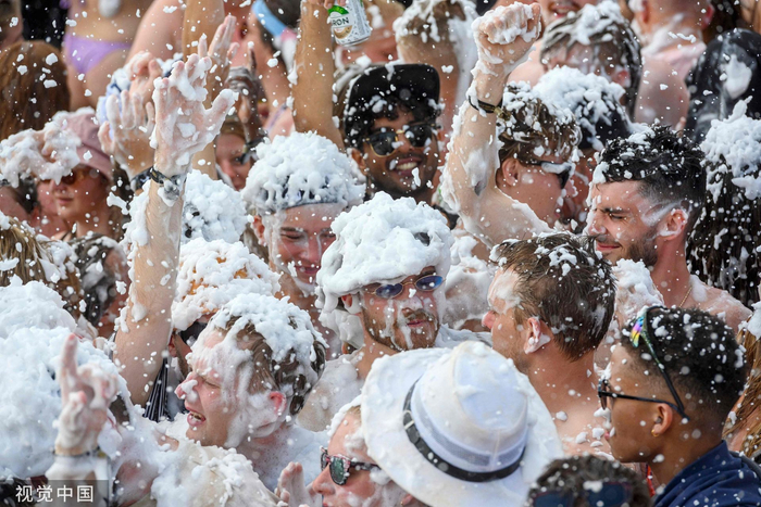丹麦罗斯基勒,当地举办罗斯基勒音乐节,民众身上覆满泡沫。TORBEN CHRISTENSEN /视觉中国