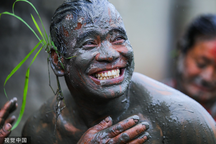 尼泊尔加德满都,在郊外的Tokha村,国家水稻日当日,一名面带微笑的男子满身泥巴,标志着水稻种植季节的开始。NurPhoto/视觉中国