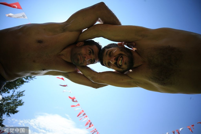 土耳其埃迪尔内,661届Kirkpinar橄榄油摔跤大赛举行,参赛选手投入比赛。Anadolu Agency/视觉中国