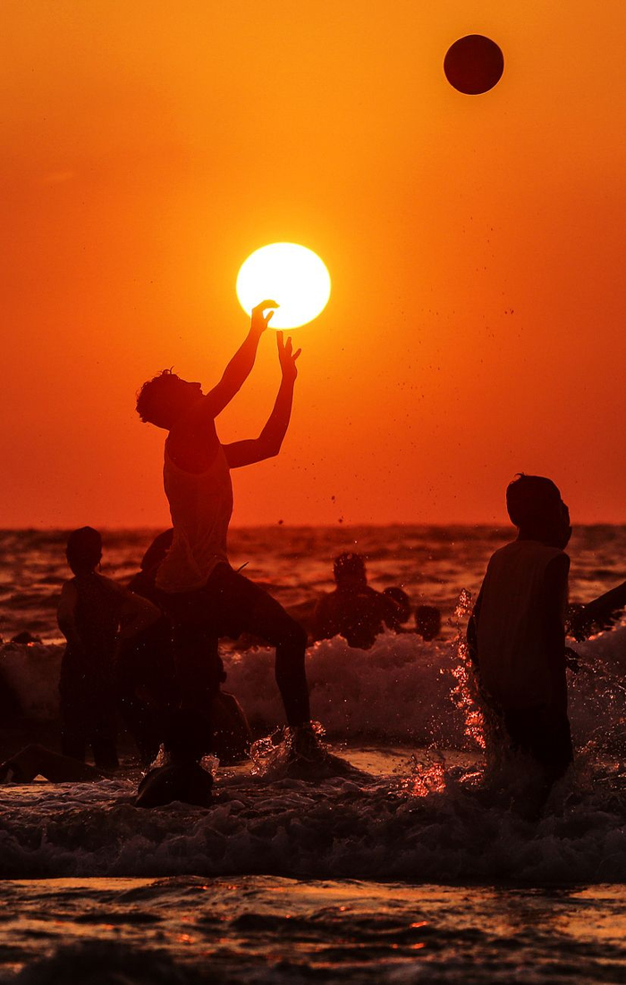 当地时间2022年7月1日,加沙,天气炎热,民众在海滩游泳玩沙滩排球,享受日落。NurPhoto/视觉中国