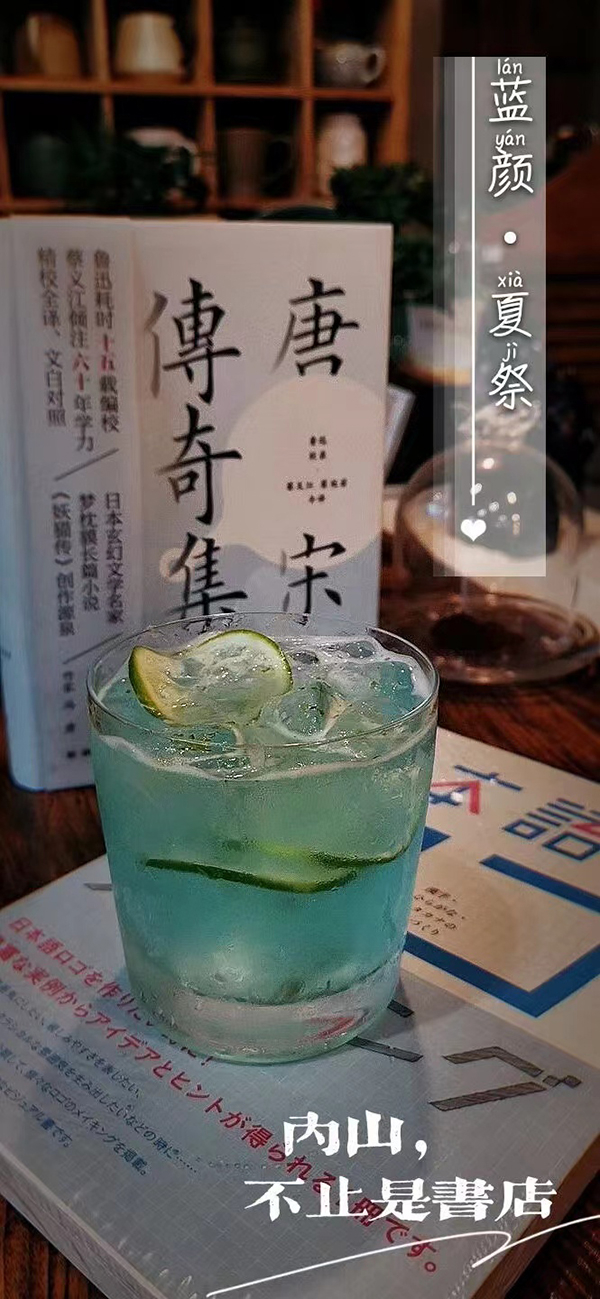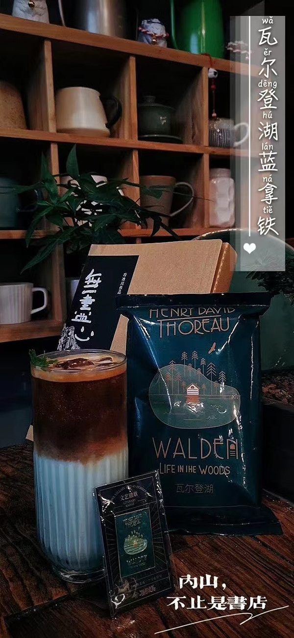 内山书店也在设计饮品时颇费心思,以来自于书中的灵感起名字和配色,比如“瓦尔登湖蓝拿铁”“蓝颜·夏祭”。