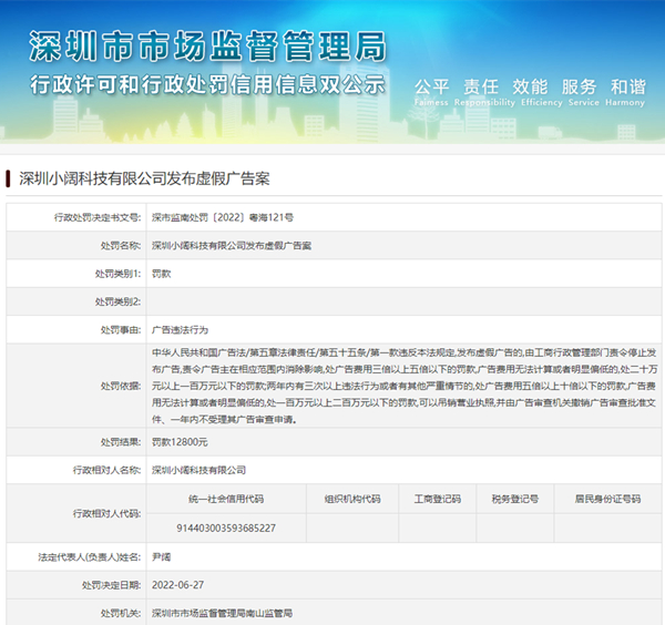 深圳市市场监督管理局网站显示,深圳小阔科技有限公司发布虚假广告,存在广告违法行为。深圳市市场监督管理局南山监管局依据《中华人民共和国广告法》,于2022年6月27日下达处罚决定,罚款该公司12800元。去年12月29日,该公司因涉嫌广告违法被深圳市市场监督管理局南山局罚款3千元。
