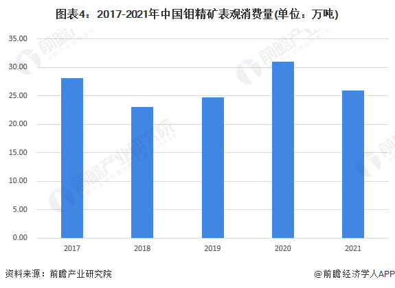 结合钼精矿的进出口量及钼精矿的产量数据,计算出我国钼精矿表观消费量,2017-2021年,我国钼精矿的表观消费量整体波动变化,2021年中国钼精矿表观消费量达到25.89万吨,同比降低16.53%。