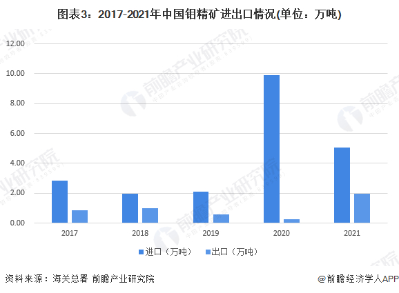 中国钼精矿主要以进口为主,2017-2018年钼精矿的进出口量均呈现波动变化,其中,受到2020年新冠肺炎疫情影响,海外钼市消费持续萎缩,但中国对疫情的有效控制,使得2020年的钼消费需求同样稳健,导致中国钼精矿进口大幅增长,2021年中国钼精矿的进出口量分别为5.04万吨和1.94万吨。