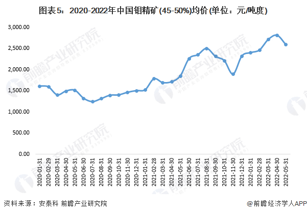 根据安泰科发布的数据,自2021年起,受宏观利好推动,中国钼精矿的价格呈恢复性上涨,钼精矿均价从2020年初的1610元/吨度上升至2022年5月末的2590元/吨度。