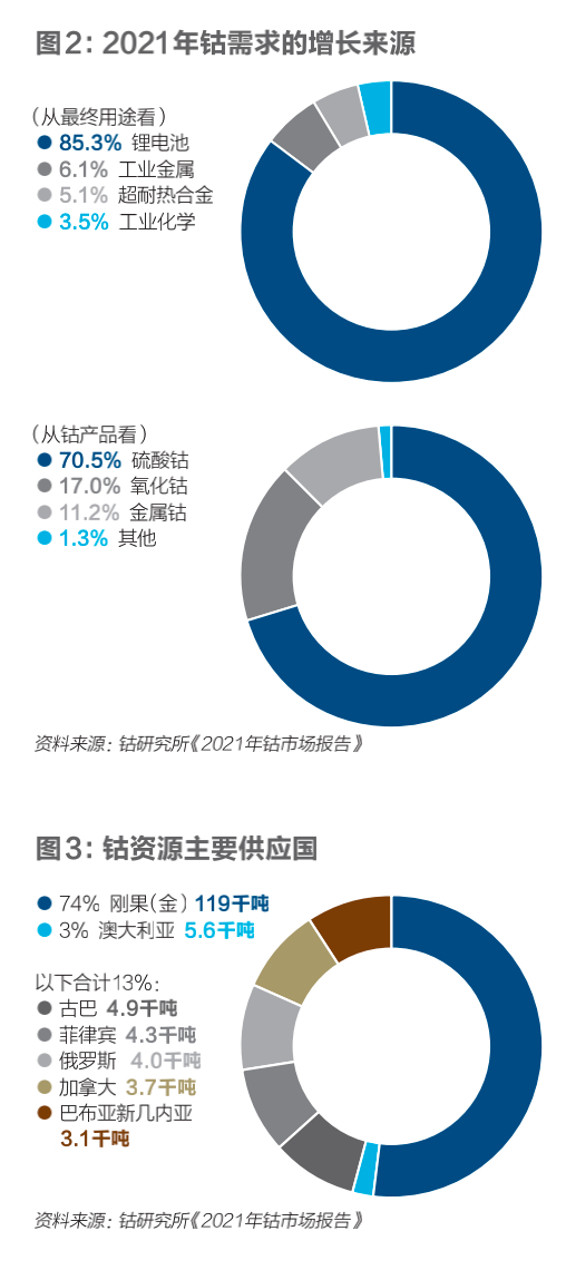 钴是锂电池正极化学稳定性和安全性的关键材料,特别是随着人们越来越偏好具有更高能量密度和续航里程的电动车,镍和钴在锂电池中的组合以其优越的能量密度和性能在电动汽车领域占据主导地位。