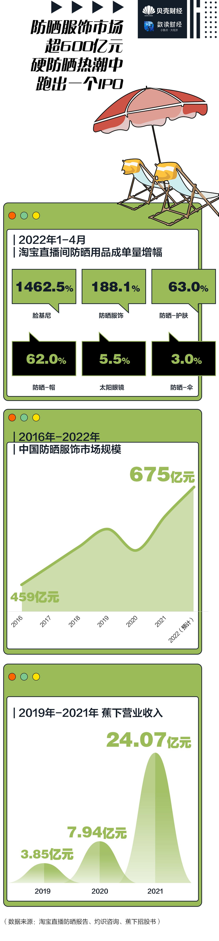 今年4月,以防晒伞起家的蕉下向港交所提交递交上市申请。2013年,蕉下针对年轻女性户外市场推出自己的首款防晒伞,随后逐渐延伸至帽子、袖套、防晒服等防晒系列产品。