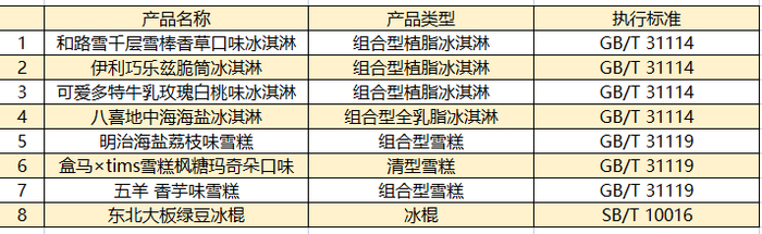 通过产品包装上标注的产品标准号,我们可以轻松地将随机选到的8款热销雪糕产品给分类出来。