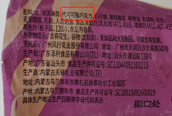还有从配料表上,我们也可以看到有些雪糕产品的奶味是源于生牛奶、稀奶油等,而有一些则是源于乳粉、乳清粉等。一些品牌的巧克力味来源于可可粉,而五羊香芋味雪糕用的代可可脂巧克力。