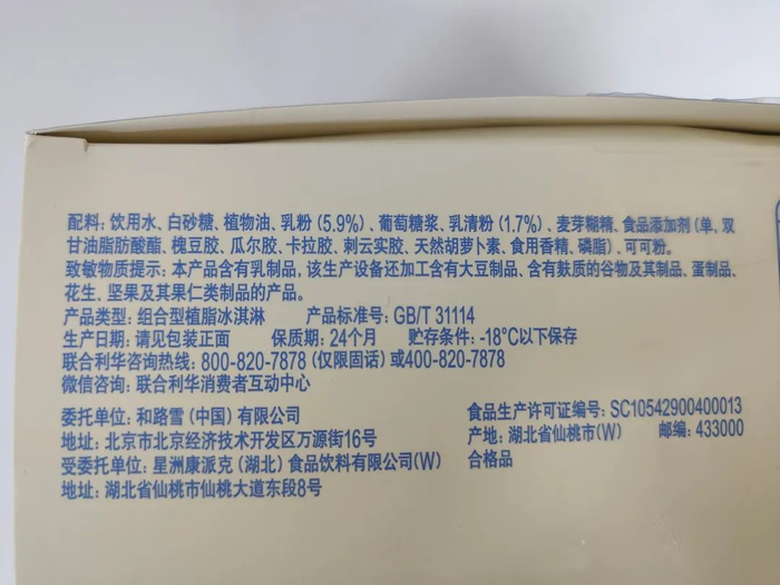 比如说,和路雪的这款千层雪冰淇淋配料前三分别是饮用水、白砂糖、植物油,而乳粉和乳清粉分别排第四和第六。