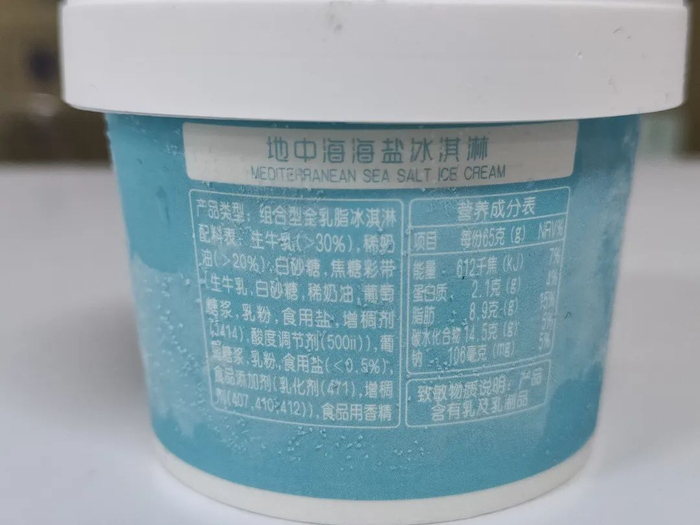 而八喜的这款地中海海盐冰淇淋配料表前三的是生牛乳(>40%)、稀奶油(>20%)、白砂糖。