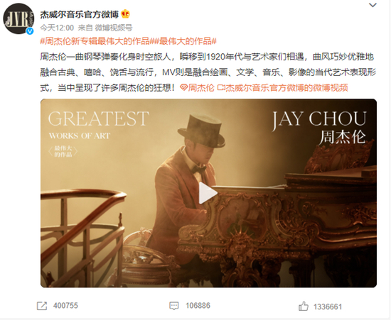 据杰威尔音乐官方微博介绍,在《最伟大的作品》中,周杰伦一曲钢琴弹奏化身时空旅人,瞬移到1920年代与艺术家们相遇,曲风巧妙优雅地融合古典、嘻哈、饶舌与流行,MV则是融合绘画、文学、音乐、影像的当代艺术表现形式,当中呈现了许多周杰伦的狂想。