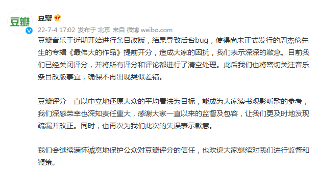 7月4日,豆瓣官方微博发文,为周杰伦新专辑《最伟大的作品》提前开分道歉。豆瓣表示,豆瓣音乐于近期开始进行条目改版,结果导致后台bug,使得尚未正式发行的周杰伦专辑《最伟大的作品》提前开分。