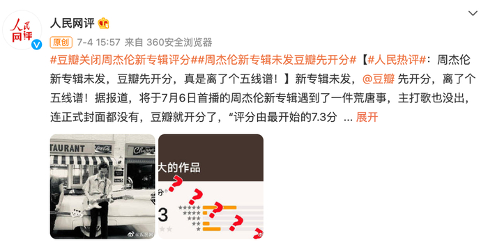 人民网评也于7月4日发表评论称,新专辑未发,豆瓣先开分,离了个五线谱!