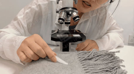 小编拿来显微镜和办公室里同事午休的披肩,来做清洗前后的实验对比;