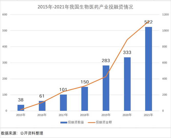 公开数据显示,2019年以来,我国生物医药领域投融资数量快速增加,到2021年共发生522起融资事件,同比增长53.1%。投融资金额来看,2020、2021年分别达到888.75亿元和1113.58亿元,其中2020年投融资金额同比增幅达108.75%,为2018年来最高。