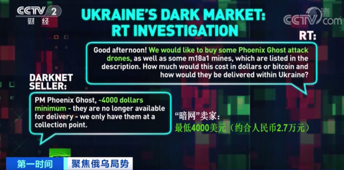 这是今日俄罗斯电视台记者假扮买家,在“暗网”与卖家沟通时的聊天记录。卖家称,不仅能够提供小型武器和美制防弹衣,还可以提供“标枪”反坦克导弹、“凤凰幽灵”战术无人机以及“弹簧刀”无人机等。