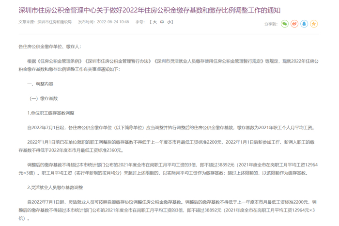 近日,市住房和建设局官网发布了《深圳市住房公积金管理中心关于做好2022年住房公积金缴存基数和缴存比例调整工作的通知》。7月1日起,公积金缴存单位应调整并执行调整后的住房公积金缴存基数,缴存基数为2021年职工个人月平均工资。