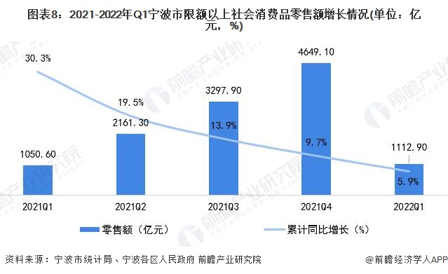 2022年一季度,宁波市社会消费品零售总额1112.90亿元,同比增长5.9%。分消费类型看,批发业增长17.2%,零售业同比增长6.3%。
