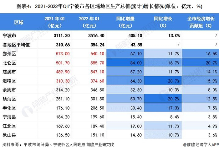 从GDP增幅来看,鄞州区、北仑区、慈溪市和海曙区的GDP总量分别位列第1至第4位,其中北仑区GDP增幅达84亿元;从GDP增速来看,海曙区和镇海区的GDP同比增速均在20%以上;从经济增长贡献度来看,北仑区、鄞州区和海曙区对全市一季度经济增长的贡献度最大,分别为20.7%、16.6%和15.9%。