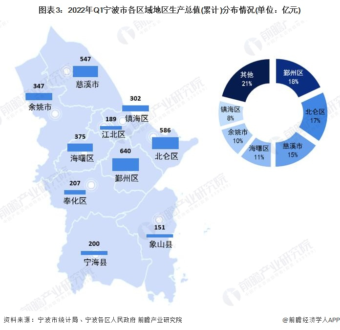分地区来看,2022年一季度,宁波市鄞州区、北仑区和慈溪市GDP总值均超500亿元,占全市GDP比重分别为18%、17%、15%;海曙区GDP为375亿元,高于全市各区平均值。