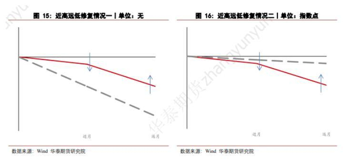 但是近月远月的到期时间并不一样,如果修复情况如左图,整体基差扩大,那么由于远月更远,实际基差变动更大,做多亏损更多,整体空近多远组合亏损。如果修复情况如右图,整体基差缩窄,那么由于远月更远,实际基差变动更大,做多盈利损更多,整体空近多远组合盈利。