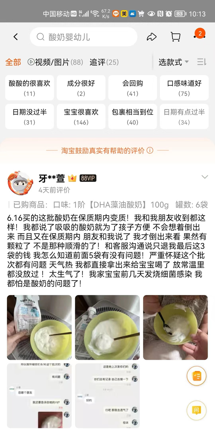 某消费者指出,“6月16日买的一批酸奶,却在保质期内变质,自己和朋友收到都这样。而与客服沟通后,也只退最后3袋的钱。”