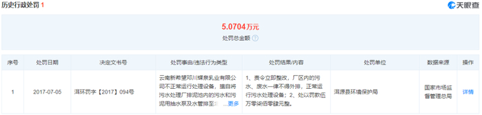 2022年5月,新希望旗下子公司昆明雪兰牛奶有限责任公司又因污水总排口水污染物在线监测设施运行维护不正常,污水总排口在线监测数据失真,被昆明市生态环境局责令限期改正违法行为,并处7.6万元罚款。