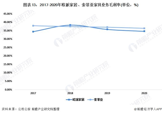 从家具业务的毛利率来看,2017-2020年欧派家居的毛利率呈先上升后下降的趋势,但基本保持在35%左右。2020年欧派家居家具业务毛利率为34.70%。