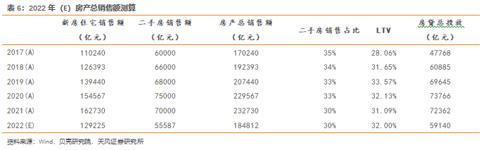 贷款价值比(LTV)指标衡量房贷投放占房产总交易额的比例。由于我国针对二套房的首付比例要求较高,可贷款价值占房产总价值比例较低。我们基于由新房和二手房组成的房产总交易额计算得出2021年LTV为31.09%。我们假设2022年LTV为近三年均值32%。