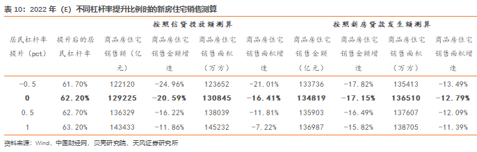 若在乐观情境下,即居民杠杆率分别提升0.5、1pct下,按照如上两种方法在其他假设不变的基础上进行测算。在居民杠杆率提升0.5pct至62.70%时,按照预测信贷投放额的方法测算出商品住宅销售金额、销售面积增速分别为-16.22%、-11.81%;按照预测新房贷款发生额的方法测算出商品住宅销售金额、销售面积增速分别为-16.49%、-12.09%。在居民杠杆提升1pct至63.20%时,按照预测信贷投放额的方法测算出商品住宅销售金额、销售面积增速分别为-11.86%、-7.22%;按照预测新房贷款发生额的方法测算出商品住宅销售金额、销售面积增速分别为-15.82%、-11.39%。