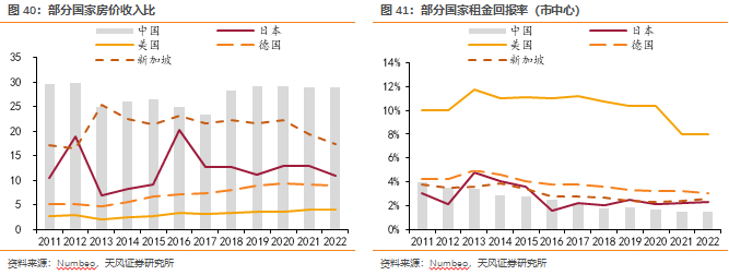 第三,遏制房地产泡沫化,防范系统性金融风险仍是政策端重要目的。1)房价收入比角度,Numbeo数据显示,2022年我国房价收入比为29.04,在其收录的112个国家和地区中排名第10。2)租售比角度,Numbeo数据显示,2011至今我国租金回报率数据整体呈下跌趋势,于2022年来到1.51%,对应月度租售比为1/789、1/698,低于国际标准月度租售比1/200-1/300。政策大幅转向带来的周期波动尤其是价格波动风险同样会增加居民杠杆的脆弱点。
