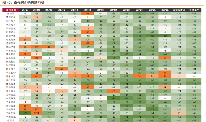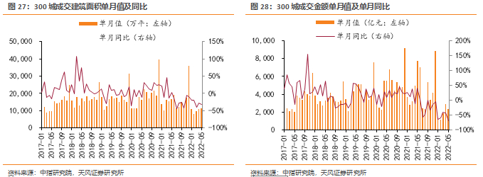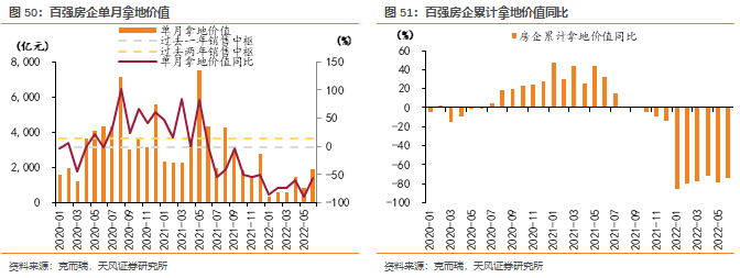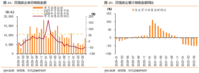 2022上半年房企销售延续快速下行趋势。克而瑞数据显示,截止22年5月百强房企累计销售金额同比降幅达52.6%,已是连续6个月同比减少。累计增速自21年2月起连续13个月下滑,不断创下有统计以来的新低。5月单月销售金额同比-60.1%,同样为历史最大降幅。一季度以来各地政策频繁刺激下,需求侧呈现一定边际回暖信号,但改善力度较弱、复苏相对缓慢。6月百强销售额环比改善幅度扩大。我们预计下半年在疫后需求回补、供货增加等因素带动下销售环比有望持续改善。
