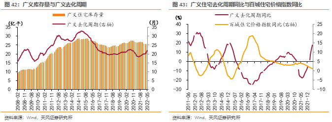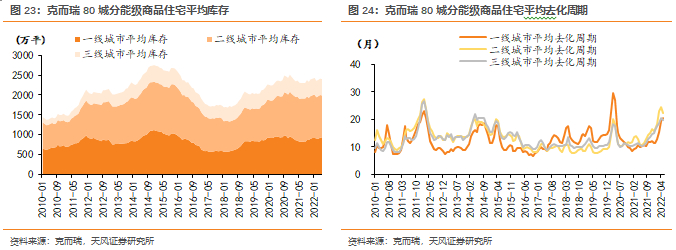 库存方面,根据克而瑞可售面积及对应去化周期,近年来我国商品房库存趋势相对稳定,2022年5月,一线、二线、三线城市平均库存分别相当于2010年至今历史高点库存的82.1%、86.3%、96.7%。去化方面,销售下滑之下,平均去化周期已来到历史相对高位19-22个月。
