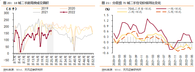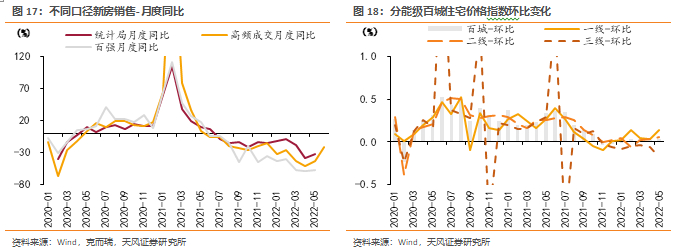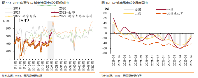 我们认为短期弱复苏趋势基本确立,复苏斜率和持续性仍有待观察。1)本轮复苏由热点城市主导,部分城市可能存在数据异动,剔除青岛及苏州样本后,基本面由持续复苏变为波动上行;2)22年4-5月地方因城施策显著发力,市场改善为需求回补、滞后网签和政策宽松的综合结果,持续性取决于真实需求空间;3)基本面分化依然存在,高能级城市好转显著,22年6月三线及以下城市商品房销售面积同比仍为-42%;4)短期内,疫情、失业和收入预期等外部变量仍是影响居民信心、扰动政策效果的重要因素。