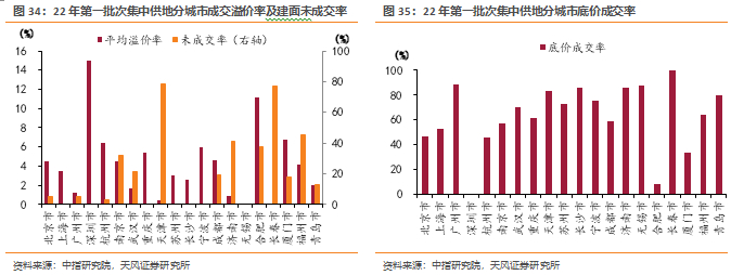 集中供地方面,重点22城土拍整体有所回暖,城市间热度分化显著。据中指研究院数据,22年第一批次溢价成交幅数比例较21年有明显上升,溢价率上升至4.78%,未成交建面比例来到22.32%,重点城市土拍市场成交有所好转。分城市来看,22年第一批集中供地中,溢价率前3城市分别为深圳(14.98%)、合肥(11.20%)、厦门(6.78%),长春(0.00%)、无锡(0.08%)溢价水平有限;建面未成交率方面,本轮上海、深圳、苏州等6个城市未出现流拍撤拍,天津、长春、福州未成交率分别高达78.64%、76.94%、45.47%。