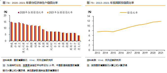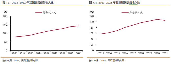 我国居民债务水平和住房贷款水平均较高。按照可支配收入衡量住户部门债务水平,我们选取债务收入比(个人贷款余额/(人均可支配收入*当年总人口))这一指标进行测算,2021年我国居民债务收入比为143.29%,该指标自2013年逐渐升高,并且在2016年即突破100%。按照可支配收入衡量房贷水平,我们选取房贷收入比(个人住房贷款余额/(人均可支配收入*当年总人口))进行测算,2021年我国居民房贷收入比为105.14%,该指标自2013年逐渐升高,在2019年突破100%,2021年首次略微下降,但房贷收入比例依然位于高位。