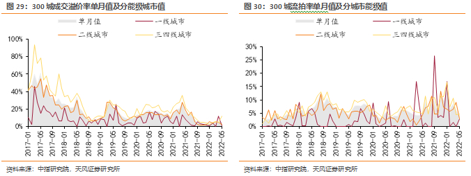 分能级来看,土地市场成交趋势分化显著。溢价率方面,2022年以来,300城成交溢价率月度波动幅度较大,5月单月成交溢价率5.1%。其中,一线城市受集中供地影响波动最为激烈,三四线城市结束半年之久的低位徘徊,5月略有回暖。300城流拍率呈下行趋势,3月流拍率有小幅增加,5月单月流拍率4.1%。分能级看,一线城市5月流拍率2.8%,表现优于二三四线城市。