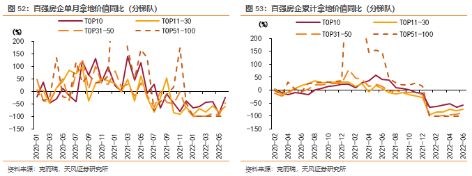 从各梯队来看,Top3、Top10、Top11-30、Top31-50年内累计拿地金额分别同比-62.3%、-65.6%、-78.3%、-94.0%,Top51-100无新增土地,房企投资信心受损严重。鉴于当前市场对未来的销售预期普遍不高且部分房企偿债压力较大,预计下半年多数企业仍会维持审慎投资策略,土地市场复苏时点或将滞后于明确的基本面拐点。