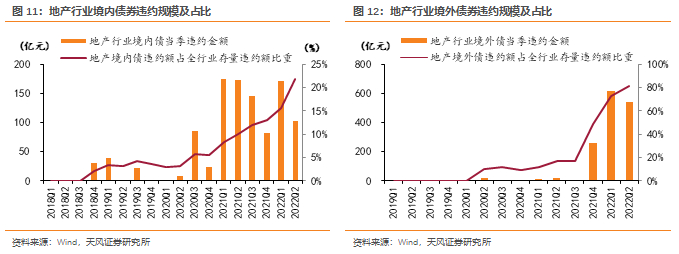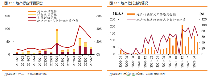 21年至今,行业信用风险不断暴露,地产行业债券、信托违约规模均来到历史相对高点。2022年1-5月,地产行业境内、境外债违约发生额高达1430亿元,地产境外债贡献了超过80%的存量境外违约。行业中短期仍面临较大的偿债压力。5月,交易所释放支持民营房企融资的积极信号,但在金融机构风险偏好转变之前,融资环境尚未出现明显改善。